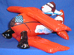Here is a custom inflatable plane. We can make a custom inflatable plane of your choice. The normal minimum quantity this item is 3000 pieces. The inflatable bi-plane has a wing span of 16" X 4" amd the fuselage length is 15 1/2" and the height is 6".