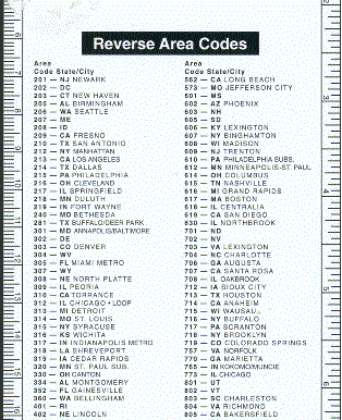The Telephone Area Code Ruler shows the area codes alphabetical by state on one side and on the other side it has the area codes in numerical sequence for your convenience. It measures 10 1/2" long X 3 1/2" X .015" thick and has an imprint area of 2" X 2". It is also available with a die cut to fit in a three ring binder or other popular daily calendars. This is an outstanding item that every business person will find a great way to use.The pictures below illustrate only a partial view of each side of the item. Minimum imprintable quantity is 1000.