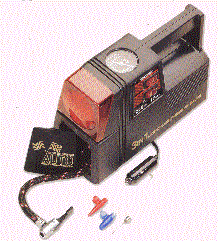 On the left is our Compact Air Compressor that is 7" X 5 1/2" X 3" and provides you with an imprint area of 4" X 1 3/8". It features a 250 psi air gauge, easy to read pressure gauge, 10" power cord w/on/off switch & cigarette lighter adapter and 3 inflation adapters. The minimum imprintable quantity is only 10.