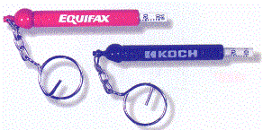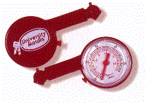 On the left we have our Brass Tire Gauge with Key Ring which has a machined brass case with plastic indicator. Range up to 50 psi.. Nickel plated split key ring and chain. About 3" in size and provides you with an imprint area of 1/4" X 1 1/4". Available in red, black, blue or white. Minimum imprintable quantity is 50. On the right is the Handi-Tire Gauge that features a tough plastic case with a precision mechanism for consistent readings. Pressure reading "holds" on the dial until released by depressing button. Available in two models, one reads up to 50 psi and the other one reads up to 100 psi. 4" long and the imprint area is 1 1/2" diameter. Minimum imprintable quantity is only 50.