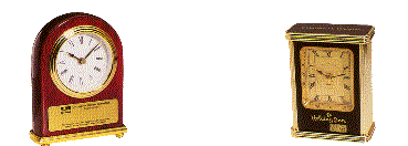 Pictured below are two elegant desktop alarm clocks. The clock on the left is a 5" X 4" X 1 3/4" rosewood lacquered alarm clock. There is an ample imprint area on the plate displayed on the bottom of the clock. The imprint area is 2" X 3/4". The quartz alarm clock on the right is 3 3/4" X 2 3/4" X 1 1/2" and it quite elegant with its colors of gold and black. The imprint area on the clock is a 1" X 2 1/2".