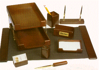 Here is a beautiful nine piece desk set of mahogany finish that includes a desk pad, double pen stand, deluxe memo holder, name card holder, double letter tray, executive letter opener, pencil holder, letter holder and a deluxe paper clip holder. And yes it can be imprinted with the minimum imprintable quantity of 25. It also is available in a six piece set.