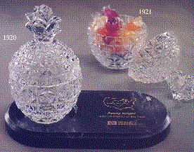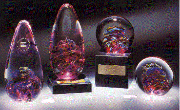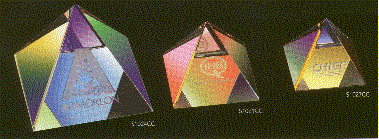 Pictured below on the left is The Flame which lets you have a crystal etched imprint on this truly beautiful award. The Flame is available with or without a base. Its dimensions are 2 5/8" wide X 5 3/4" high X 2 5/8" deep. The imprint area is 1" X 1 1/4" and the minimum is only one. The two awards on the right are the Corona which also has a crystal etched imprint. The size of the Corona is 3 1/8" wide X 2 7/8" high X 1 1/8" deep. The imprintable area is 2 1/4" diameter circle. Minimum quantity on the Corona is two.