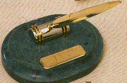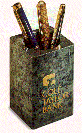 Pictured below is a Marble Single Pen Stand with Brass holder that holds a quality pen. Size of the item is 4 1/4" X 3 1/2".