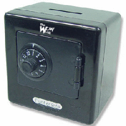 The 3 1/2" Plastic Combination safe bank has an actula working combination. The imprint area is 2 1/2" X 4" on the front or it can also be printed on the top in an area of 2 1/2" X 3/4". Banks are available in Light Blue, Yellow, Red, Green and Black. Also available in metal in a larger size of 5' X 5". Minimum imprintable quantity is 150.