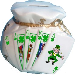 The Luck of the Irish ceramic bank measures 4" high X 4 1/4" diameter. They can be custom imprinted on both the top and back. Minimum order on a custom imprinted order is 120. Minimum order on non-imprinted is 12.