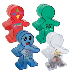 Save your way to financial success with a promo that speaks to the times! Everyone's talking about saving. When you hand out this 4 1/8" X 5 7/8" X 2" People Bank in your next campaign, they'll get your message loud and clear! You get a generous imprint area for your logo for maximum brand exposure. Banks, credit unions, nonprofits and children's charities are all perfect promotional fits. Encourage the young ones to start saving and your campaign will be a winner! Your custom imprint area can be 1 3/8" X 2 1/4" on the Torso, 1 7/8" X 1 3/4" on the head or 2 1/2" X 4 2/8" on the Head and Torso. Less than $ 3.70 each in the minimum of 100.