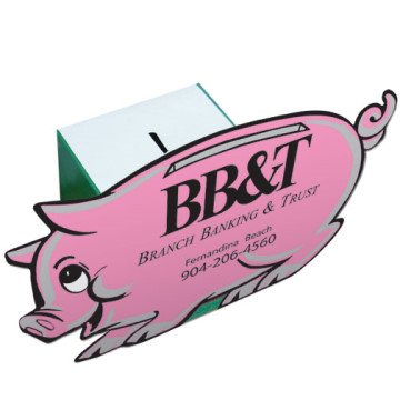 These plastic piggy banks each measure 5 1/2" X 3 1/2" and provide an imprint area of 1 3/4" wide X 1" high. They are available in colors of Red, Pink, White Purple, Flourescent Lime, Petunia, Electric Blue and also available in Pale Green Glow in the Dark color. Minimum imprintable quantity is 300.