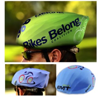 Bicycle helmet cover - identifies and colorfully decorates all sizes of bike helmets. Protects from dust, scratches and sun-fading. Flexible fit, breathable Lycra nylon material with elastic hem conforms to all helmet shapes. All-over full color imprint area. Room for lots of event and sponsor logos. Easy and compact to store in any bike storage bag. Includes full color imprint. Less than $ 6 each in the minimum imprintable quantity of 250.