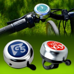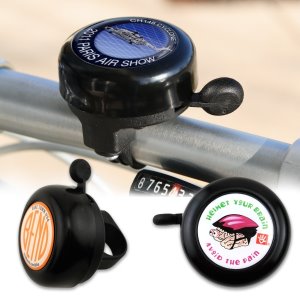Silver or Black Bike Bells- Perfect gift for the commuting and recreational cyclist! Bicycle bell gently rings to safely announce a bicyclist's approach. Choice of silver or black aluminum with plastic base and lever. Flexible fit for all bike and tricycle handlebars. Includes a full color 1-7/16" round imprint with epoxy dome. Less than $ 5 each in the minmum of 100.