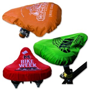 9 1/2" Bicycle seat cover - an easy (and quick!) waterproof 'raincoat' for bicycle seats. Protects all sizes of bike seats from inclement weather, dust and sun-fading. Flexible fit, long wearing nylon material with elastic band fits bike seats from extra-slim to extra-large. Easy and compact to store in any bike storage bag. Extra large imprint area, approximately 8" long by 6" wide. Choice of spot color or full color imprint. Minimum custom imprint order is 250. Call 800 960-9080 for current pricing.