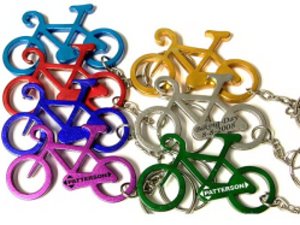 Bicycle shape 2 1/4" X 1 11/32" bottle opener with key chain. A great gift of beer bottle and pop bottle key holder! Great for bike lovers! Solid aluminum construction with metallic color finish. Ideal for key holder, key tag, key chain, key ring, travel, biking and self promos. Custom imprint area is 3/4" X 5/32". Less than $ 85 each in the minimum of 125.