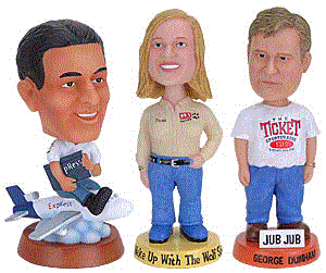 Here are two stock Bobbleheads that can have your imprint on the base and the minimum quantity is only 100. They are about 5 1/2" high and each provides an imprint area of 1 3/4" X 1/2". Available for quick shipping.