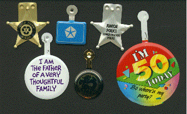 We have many sizes and shapes of buttons availble. We are able to do quantities as low as 50 buttons in a weeks time or less. We are able to provide both celluloid buttons and the less expensive lithographed buttons and tabs in larger quantities for your needs. Lithographed buttons are actually printed right on the metal finish while celluloid buttons are printed on paper and then a celluloid cover is inserted over the paper. Sizes range from 1" to a 9" button with many sizes in between. We offer one week or less delivery on many of our celluloid buttons ! For a free catalog on buttons call 800 960-9080 or 206 285-5359 (Seattle) or email us at donace@promotionalproductsandideas.com or don_shepherdson8@msn.com