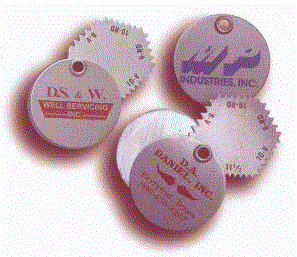 Primarily used in the Oil Industry the Thread Gauge is made of .020 stainless steel and provides five of the most popular threads. It measures 1 1/2" in diameter and provides an imprint area of 1 3/8" diameter on the front cover.. Minimum imprintable quantity is 250.