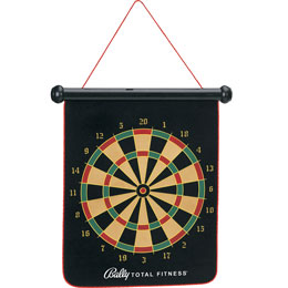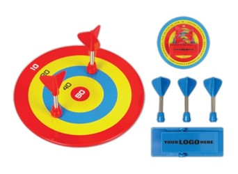 The Magnetic Dartboard is 15" and a 18 1/2" size with the minimum custom imprintable quantity being 25 and provides an imprint area of 12" X 2". Each dartboard comes with 3 red magnetic darts.
