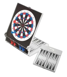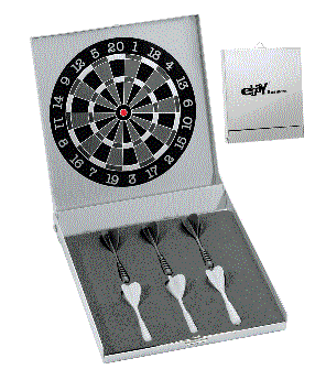 Comes in an aluminium box and can be used for both darts and backgammon. It measures 6 3/4" X 6 1/4" X 7/8" and provides an imprintable area of 1 3/8" X 1/2". Minimum imprintable quantity is 25.