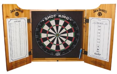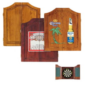 The Game Room dartboard center has authenic bristle dart board. The 19" diameter board is made of sisal fiber and is fitted with a moveable number ring. The cabinet is constructed from specially selected pine with dove tail joint construction and fitted with brass hinges for the sel closing doors ,pinted with dry erase scoreboards. Includes two sets of steel darts and a dry erase marker. The imprint area is 14" X 16" Minimum imprintable quantity is 30.