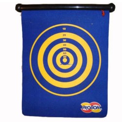 This dartboard is a 15" X 17" dartboard that can be rolled up for travel. It comes with 3 velcro balls. It has a large imprint area as per the picture. The imprint area is 12" X 14". Minimum imprintable quantity is 24.