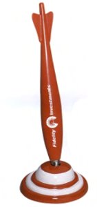 The 4 1/2" Dart Pen rests on a red and white target shape stand. The custom imprintable area is 1/2" X 1 1/4". The custom imprint area on the pen is 1/2" X 1 1/4". Minimum imprintable quantity is 50.