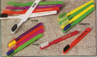 These imprinted toothbrushes are available in colors of Pink, Blue, Yellow, Purple, Racing Green, Black, Red, Orange and White. All toothbrushes are of professional quality and each is packaged in its own poly bag. All brushes are made from soft, end rounded .7 DuPont Tynex nylon. Minimum imprintable quantity is 432.