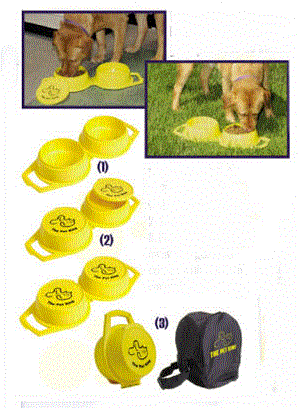 The portable feeding and watering unit is a great travel item for both you and your pet. It operates as easy as fill the bowls with food and water, snap on the lids, fold together and away you go. Available in two sizes - The Pet King and the Pet King Jr. for smaller dogs and cats. It also comes with its own travel bag. Minimum quantity with an imprint is 48 and the imprint area is 1" X 2" on the Yellow lid.