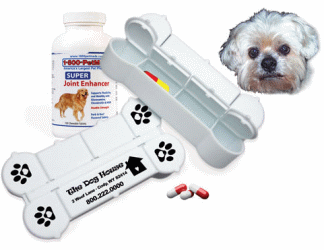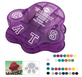 Measuring 2 1/4" wide X 4 1/4" long X 3/4" high the Dog Bone Pill Box is a seven compartment medicine container. The imprintable area is 1/2" high X 1 3/4" wide. Minimum imprintable quantity is 250.