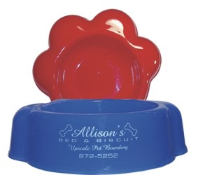 The 12 1/2" X 3 1/2" Paw shaped Pet Bowl is available in colors of Translucent Blue, Translucent Red or Translucent Purple. It provides an imprint area of 2" high X 5" wide with an imprintable minimum quantity of 60.