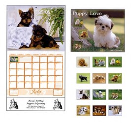 We have many different dog and animal calendars for the Year 2011. Pictured below is a sheet from the Puppy calendar which is a 11" X 19 1/2" open size calendar with an imprint area of 10" X 2" and the minimum imprinted imprintable quantity is 200. We have many other animal related calendars - for cats, dogs, horses, etc. Just give ius a call at 800 960-9080 to discuss your calendar needs.