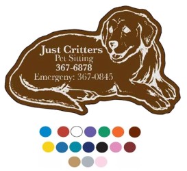 We have many magnets available in various dog breeds that you can have your custom imprint on. The dog magnet pictured below measures 3 5/8" X 2 3/8" and the imprint area is 3/4" X 1 1/4" and the minimum imprintable quantity is 250.Available in 17 different colors.