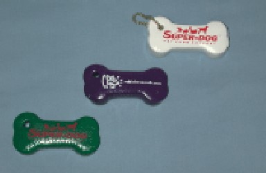 The Dog Bone Floating Key Tag is made of 3/4" thick closed foam rubber and vinyl dipped so that it is completely caoted, shiny, durable and washable! Available in Red, Orange, Yellow, White, Royal Blue, Black, Purple, Green, Lime Green & Teal. Minimum imprintable quantity is only 100