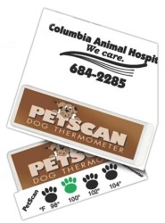 The Petscan Thermometer comes in a quarter wallet with a instruction sheet and can be placed on the dog or other animals stomach and the thermometer will determine if the animal has a fever. The size of the item is 3 3/4" X 1 1/4" and it has an imprint area of 3" X 3/4" with a minimum imprintable quantity of 250.