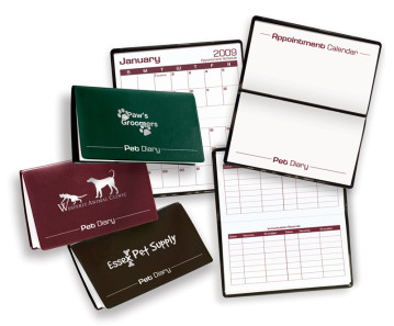 This conviently sized Pet Diary is a useful and convient way for pet owners to organize and keep track of their dcompanion's immunizations, medical history, care providers, and other important vital pet records. It contains both a Pet Diary and an Appointment Calendar. It is a must hace for pet owners. Minimum order is only 100 .Please call us at 800 960-9080 for current pricing