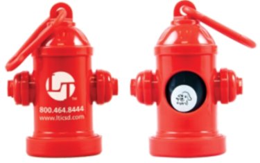 Thw 2.6" X 3 1/2" X 1 3/4" Pet Trash bag container, fire hydrant shape, with 20 bags. Comes with 1 roll of 20 bags and refills are available. Custom imprint area is 1" X 1.1. Less than $ 3.60 in the minimum of 50