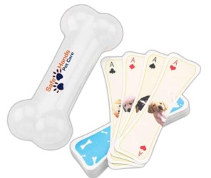 The 1 1/2" X 5" clear bone-shaped playing cards have a different breed featured on each face card. The imprintable area is 2 1/3" X 9/16". Minimum imprintable quantity is 150 decks.