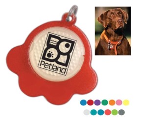 The 2" X 2" X 1/4" Reflective Dog Paw ID Tag is available in 13 different colors. It has an area for your pet information. Minimim imprintable quantity is 250.