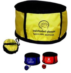 The 7" diameter X 4" high Collapsibe Bowl is a great product for pets when they travel. Made of lightweight durable construction, this unique product folds into a 3" diameter disc when not in use. It is small enough to fit in your product or it can be attached to your pet's collar with the clipthat is provided. Available in Gold, Red and Blue. Minimum imprintable order is 100.