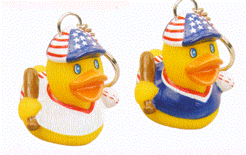 The Patriotic Baseball Duck Key Chain is available with either a White or Blue Jersey. They are 2 1/4" long X 7/8" wide X 2 1/4" high and provide an imprint area of 5/8" wide X 3/16" high. Minimum imprintable quantity is 50.
