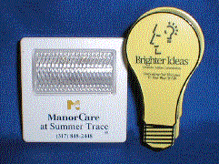 On the left we have the Thin-Light which measures 2 3/4" X 2 3/4" and provides an imprint area of 2 1/2" X 1" and is available in colors of white, ivory and rose. The Light Bulb night light measures 1 3/4" X 3 1/2" and has an imprint area of 1 3/8" diameter and it is available in white or yellow. Minimum imprintable quantity is 125.