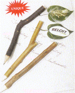 These Twiggly pens or pencils are individually handcrafted natural twig hand-drilled and the pencils are lead free. Your imprint appears on the silk leaf attachment that is on each of the pens or pencils. No two of these items looks exactly alike. The minimum quantity of either the pen or pencil is 100.
