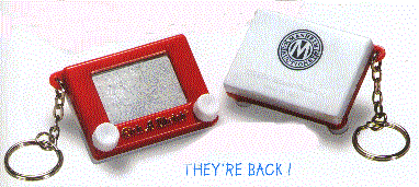 The original Etch A Sketch is back and is now available with your custom imprint. Available in both pocket and key chain versions. these games are perfect for the traveling executive who spends time in airports. Pictured below is the Pocket Etch A Sketch that measures 4 1/4" wide X 3 3/4" high X 1" diameter. The imprint area is 1 1/2" wide X 3/4" high on the back or 1" wide X 1/8" on the front. The minimum custom imprintible quantity is 150.