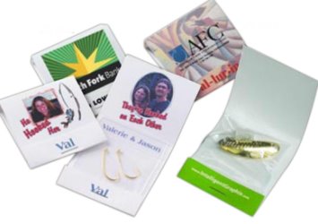 Shown below are a few of the available matchbook lures where we can custom imprint the matchbook area. We have a wide array of lures available. The imprint area is 2 1/4" X 5 1/8" and the covers can be printed in full color. Minimum imprintable quantity is 100 and they are less than $ 3.00 each.