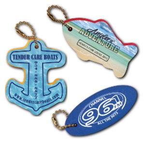 The 3 1/4" X 1 7/16" X 3/4" Floating keychain are a must for all fishermen and boater. Don't let your keys float to the bottom of the lake. Less than $ 1.35 each in the minimum of 250. Great giveaways for marinas, insurance agencies, boat dealers and fishing lodges. The soft foam is buoyant enough to float approximately four keys. Can also be done in custom shapes