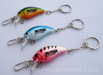 This realistic 3" fish lure keychain is perfect for any fisherman. Assorted designs. Fish lure is made of plastic, key ring made of metal. Less than $ 1.50 each in the minimum of 360.