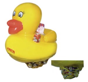 Floating beverage cooler/holder in inflatable 22" X 23" X 24" duck design. The drink cooler on the bottom holds 8 cans of drink, and top holds 4 cans and a 10" dish for holding other belongings. Comes with a 6" hand pump. Custom imprint area is 5" X 4". Less than $ 8.15 each in the minimum of 100.