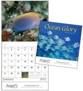 Calendars with photos of fishing scenes. Trophy fish are biting year round on this exciting 13-month calendar. A great tool for outfitters, bait shops and resorts. Made from gloss paper stock and UV coated cover. Features high quality imagery. Closed calendar size is 10" x 10". Catch attention every month. The imprint area is 9" wide X 1 1/4" high. Minimum imprintable quantity is 150 and they are less than $ 1.50 each.On the left is the 10" X 19" Stapled, 13-month appointment calendar with fish under the sea images on gloss paper stock and UV coated cover. Closed calendar size is 10" x 10". Spectacular sea life delivers your message. Top markets: retail, financial, general services. Perfect for mailing. The imprint area is 9" wide X 1 1/4" high. Less than $ 1.50 each in the minimum imprintable quantity of 300.