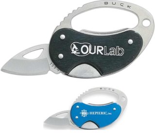 An open and shut case! With two convenient uses, the Buck (R) Metro is made of 100 percent post consumer Paperstone composed of recycled paper and petroleum free resins from raw materials. It is a combination 1 1/8" knive blade and bottle and soda can opener. This very handy device features a 2 3/8" anodized, aluminum handle and attaches to a key ring for easy transport. Ideal for military use, hunting trips and fishing expeditions. A great way to promote a new restaurant or campsite. Add your custom imprint and give a gift that's unique! Boxed. $ 20 each in the minimum order of 50.