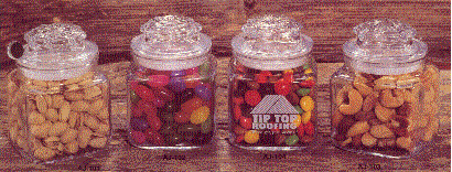 Here are 4 1/4" tall X 3 1/8" diameter apothecary jars with your choice of nuts, jelly beans or chocolates. Your imprint appears on the outside of the jars. Minimum imprintable order is only 12.