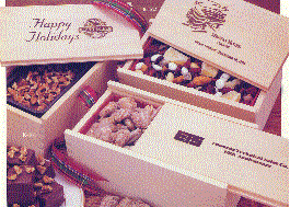 The upper left contains three quarters of a pound of Chocolate Pecan Fudge, the upper right pictures praline-sugar coated pecans which is a traditional Southern confection. The rich flavor is definitely beyond compare. In the right hand corner is the Cranberry Delight which is a mix of dried cranberries, almonds, dates, yogurt raisins, pineapple and sunflower seeds. Long after these treats have vanished the wooden collectors boxes will be a cherished reminder of your thoughtfullness. Minimum imprintable quantity on any of thee three delights is 24 units.