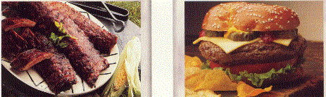 Pictured below on the left are four slabs of thick meaty ribs. This is what grilling is all about - great big juicy slabs of baby backs ! These premium pork ribs are a real barbecue feast. Available in either 4 slabs of 1 1/4 lb slabs of Pork Baby-Back Ribs or available in precooked Pork Loin Back Ribs of four 14 oz slabs. Pictured on the right is the Premium Gourmet Steak Burger that is made from the finest thick, juicy burgers that are made from only lean chopped steak with only 15 to 19% fat. Mouth-watering, absolutely flavorul and simply perfect for sizzling on your grill. Available in six 8 oz. patties (3/4" thivk), twelve 8 oz. patties (3/4" thick), twenty-four 8 oz. patties (3/4" thick) or a Premium "Lean" in a quantity of twelve 4 oz. patties.